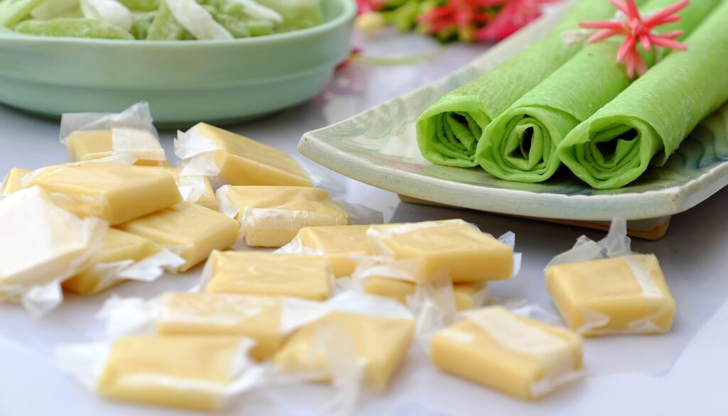 - Món ăn đặc sản: Bến Tre nổi tiếng với nhiều món ăn ngon, đặc sản như bánh xèo, bánh tét lá cẩm, bánh phong, bánh quy dừa và mứt dừa.